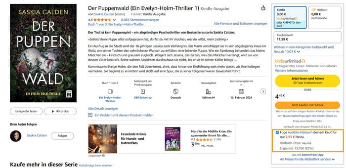 Schritt 2. Suchen Sie auf der Buchseite nach dem Kontrollkästchen „Füge Audible-Hörbuch deinem Kauf für nur xxx € hinzu“. Wenn Sie dieses Kästchen aktivieren, werden sowohl die Kindle-Version als auch die Audible-Version in Ihren Warenkorb gelegt und zusammen gekauft.